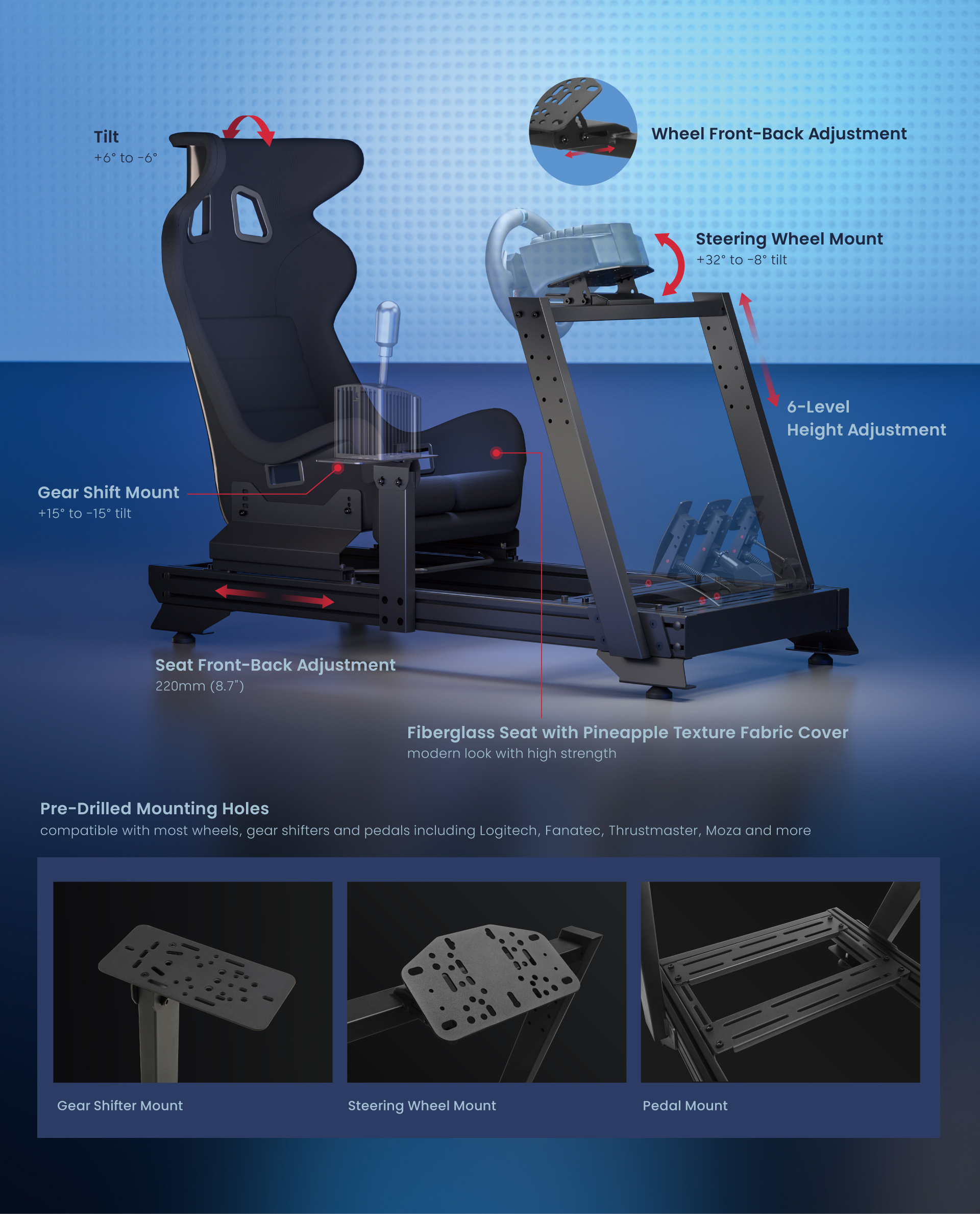 Кокпит LUMI LRS16-BS04 отличается каркасной конструкцией, сочетающей железо и алюминий, что обеспечивает как эргономичность, так и высокую прочность. Сиденье LRA02-BS01 изготовлено из стекловолокна и обтянуто тканью, напоминающей замшу, что придает ему современный вид и гарантирует долговечность. Крепление рычага переключения передач, крепление руля, крепление педалей и сиденье можно регулировать в соответствии с личными предпочтениями. Предусмотрены предварительно просверленные монтажные отверстия, совместимые с рулями и педалями наиболее популярных производителей оборудования для симуляторов гонок, таких как Logitech, Fanatec, Thrustmaster, Moza и др.