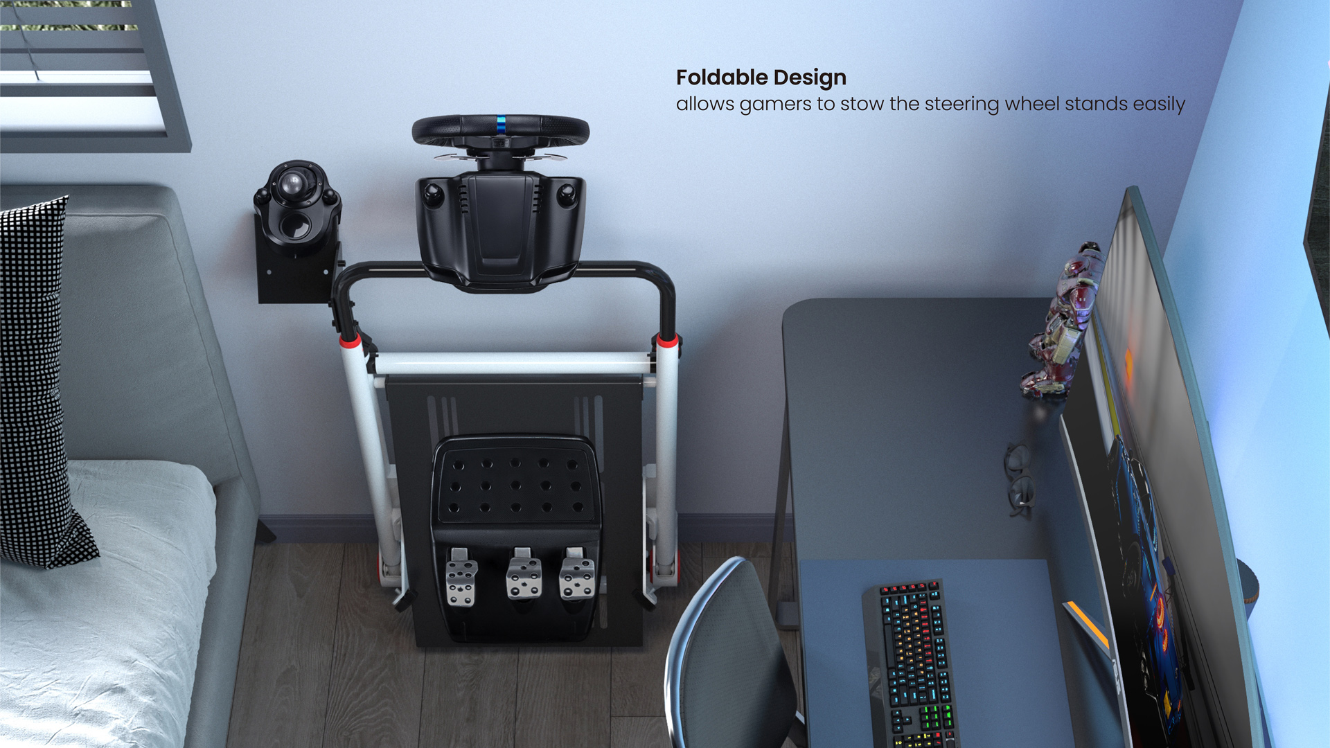 Эта стойка для руля — одно из самых портативных периферийных устройств для гоночных симуляторов, обладающее достаточной выносливостью для агрессивного вождения в напряженных заездах. Она помещается между экраном и креслом/диваном практически где угодно. Складная конструкция позволяет удобно хранить стойку, просто прислонив ее в сложенном виде к стене. Кроме того, полностью регулируемая конструкция позволяет получить оптимальный опыт, создав реалистичное гоночное место.